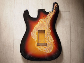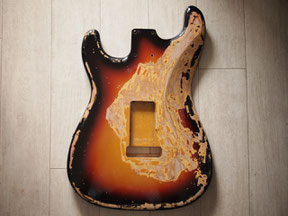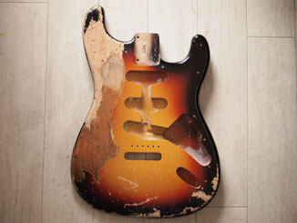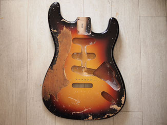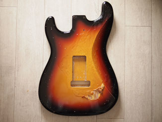 このボディはMJTのアルダーサンバーストボディで、よく見ると左用のトレモロザグリがあって、「ああSRV用ね」っていうのが分かります。