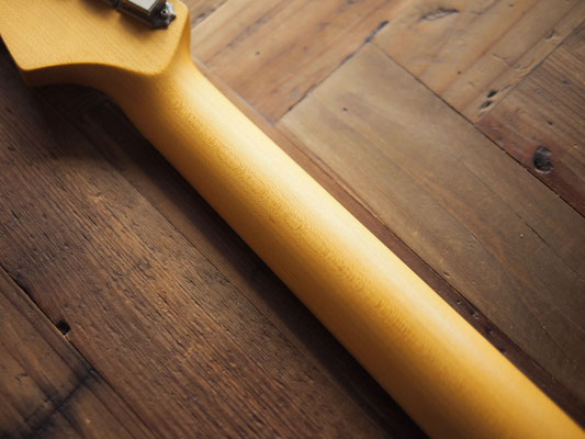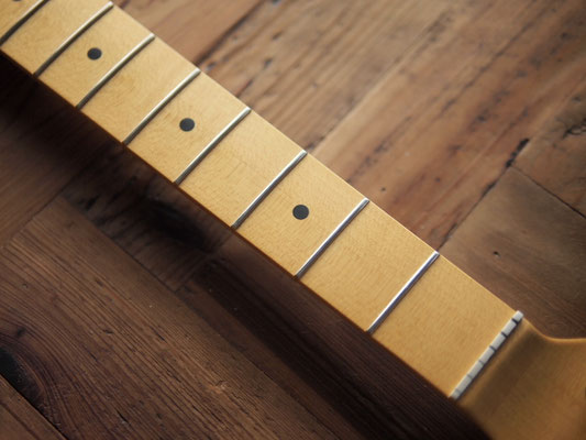 ネックにはクォーターソーンのメイプル材を使用。指板はいわゆる『貼りメイプル』(2ピース)仕様です。