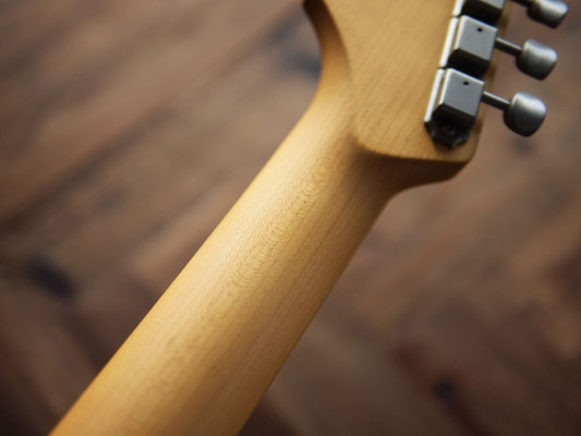 ネックはしっかりとした木取りのクォーターソン(柾目どり)メイプル。指板はいわゆる『貼りメイプル』(クォーターソーン)。