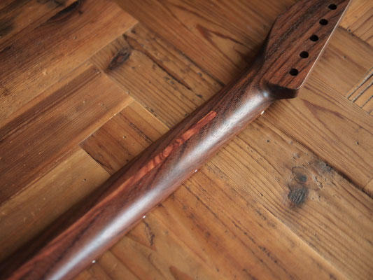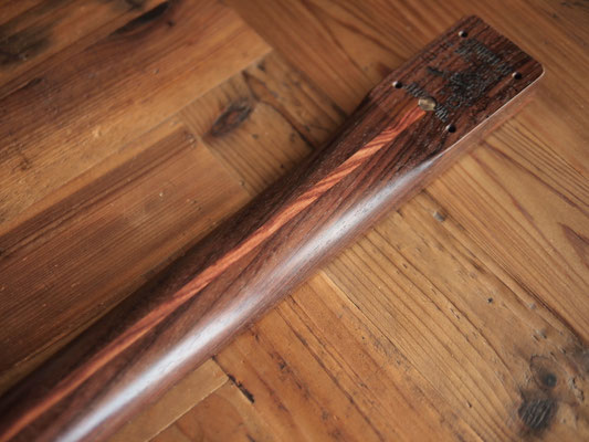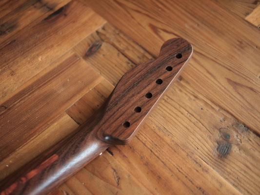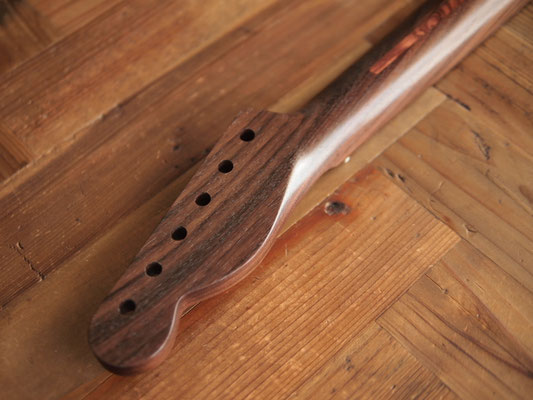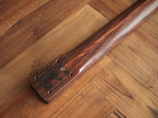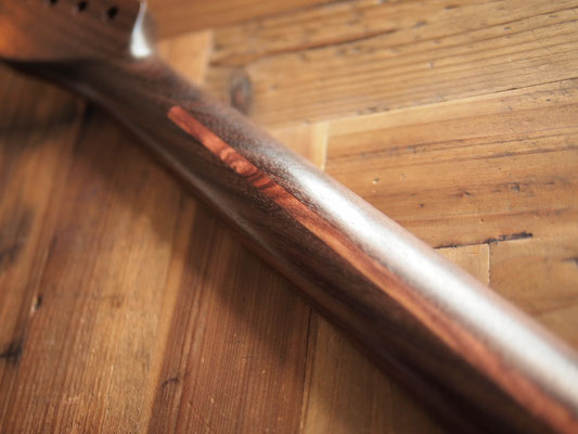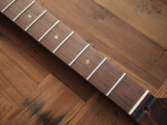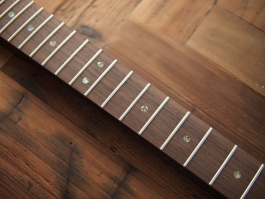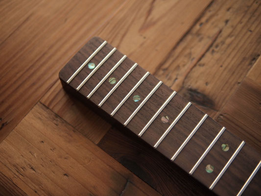 インディアンローズウッドを2ピースで使用。いわゆる『貼り指板』仕様です。1ピースよりも音の立ち上がりに優れると言われます。